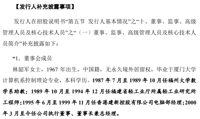 不僅如此,從上述信息來看,在“福州有恆電子開發有限公司”存續期內,林韶軍女士也應當在該公司內任職並擔任法人代表,但是這在反饋意見中關於林韶軍女士的個人履歷中並未提及。