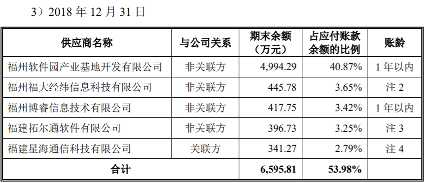 再來看長威科技的財務數據,根據招股書披露,長威科技在2018年末對“福州軟件園產業基地開發有限公司”有應付賬款餘額4994.29萬元,賬齡為一年以內款項;該筆款項後於2019年被實際支付。