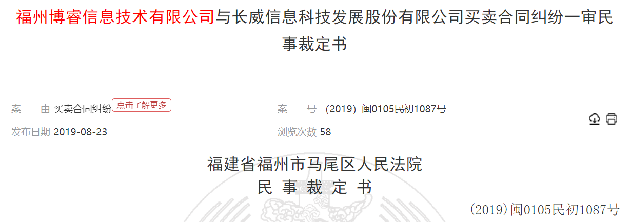 根據《裁判文書網》顯示《民事裁定書》【(2019)閩0105民初1087號】,“福州博睿信息技術有限公司”曾於2019年7月對長威科技提起訴訟,後撤回起訴。