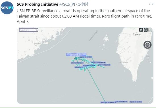 報道稱,根據“南海戰略態勢感知”計劃平台7日上午在推特發佈的信息,美國海軍一架EP-3E偵察機在7日清晨3時17分飛經台灣南方的巴士海峽後,轉飛向西北方,在中國大陸沿海及台灣西南空域對中國大陸進行抵近偵察,上午5時許到7時許有長達2個小時之久,都在台灣西南空域打轉。