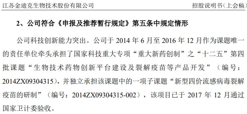 與此同時,招股書針對金迪克的“國家重大科技專項”項目詳細信息披露為:公司於2014年6月至2016年12月作為課題唯一的責任單位牽頭承擔了國家科技重大專項“重大新藥創制”之“十二五”第四批課題“生物技術藥物創新平台建設及裂解疫苗等產品開發”(編號: 2014ZX09304315),並獨立承擔該課題中的一項子課題“新型四價流感病毒裂解疫苗的研製”(編號:2014ZX09304315-002),該項目已於2017年12月通過國家衞計委驗收。