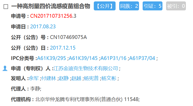 另據招股書披露,金迪克擁有的唯一一項發明專利,同時也是該公司核心產品依託的發明專利“一種高劑量四價流感疫苗組合物”是在2017年申請的專利。