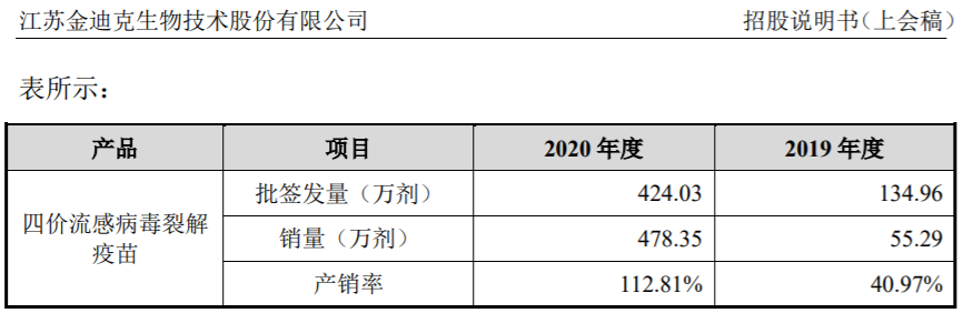 此外,根據招股書披露,金迪克的四價流感疫苗產品在2019年和2020年的籤批發量合計約為559萬劑、銷量合計約為533.64萬劑,這對應着近兩年的產銷差數量將近25.35萬劑。