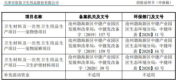 但是,後一版招股書新增的募投項目“衞生護理材料項目”的備案文號,還是早於前後兩版招股書均涉及到的募投項目“寵物墊項目”和“寵物尿褲項目”,在此背景下,“衞生護理材料項目”卻沒有被列入到前一次招股書的募投項目中,對此依依股份並未接受記者採訪。