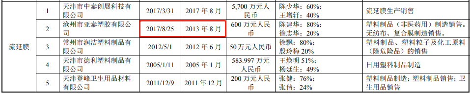更何況,根據招股書披露的“各類原材料的前五大供應商”信息,依依股份的主要原材料“流延膜”的供應商之一為“常州市亞泰塑膠有限公司”,該供應商成立時間是2017年8月,但是招股書顯示雙方首次合作是在2013年8月,這並不符合正常的商業邏輯。