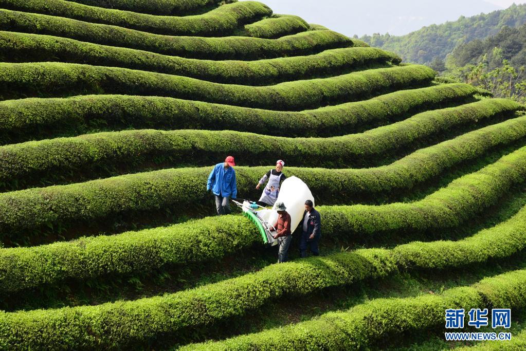 4月6日,浙江杭州建德市的茶農操作採茶機採收春茶青葉。 春季裏,隨處可見農民們辛勤勞作的身影,如同一幅幅生機勃勃的畫卷。 新華社發(寧文武 攝)