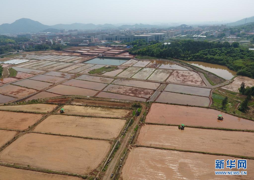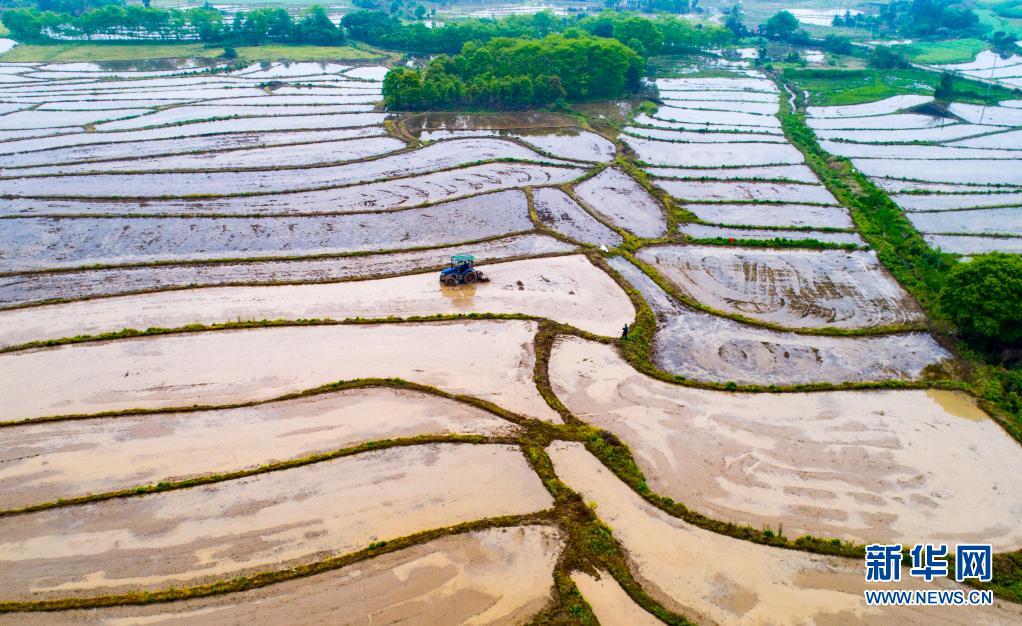 4月6日,江西省新余市仙女湖區鈐陽辦事處白田村農民駕駛農機耙田、施肥,為早稻插秧作準備(無人機拍攝)。 春季裏,隨處可見農民們辛勤勞作的身影,如同一幅幅生機勃勃的畫卷。 新華社發(趙春亮 攝)