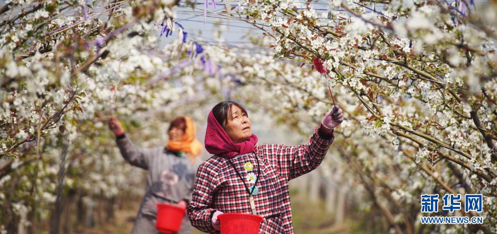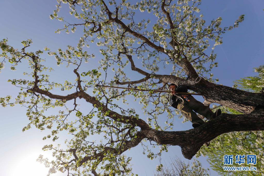 4月6日,山東濱州鄒平市長山鎮八方農場的果農在給梨花授粉。 春季裏,隨處可見農民們辛勤勞作的身影,如同一幅幅生機勃勃的畫卷。 新華社發(董乃德 攝)