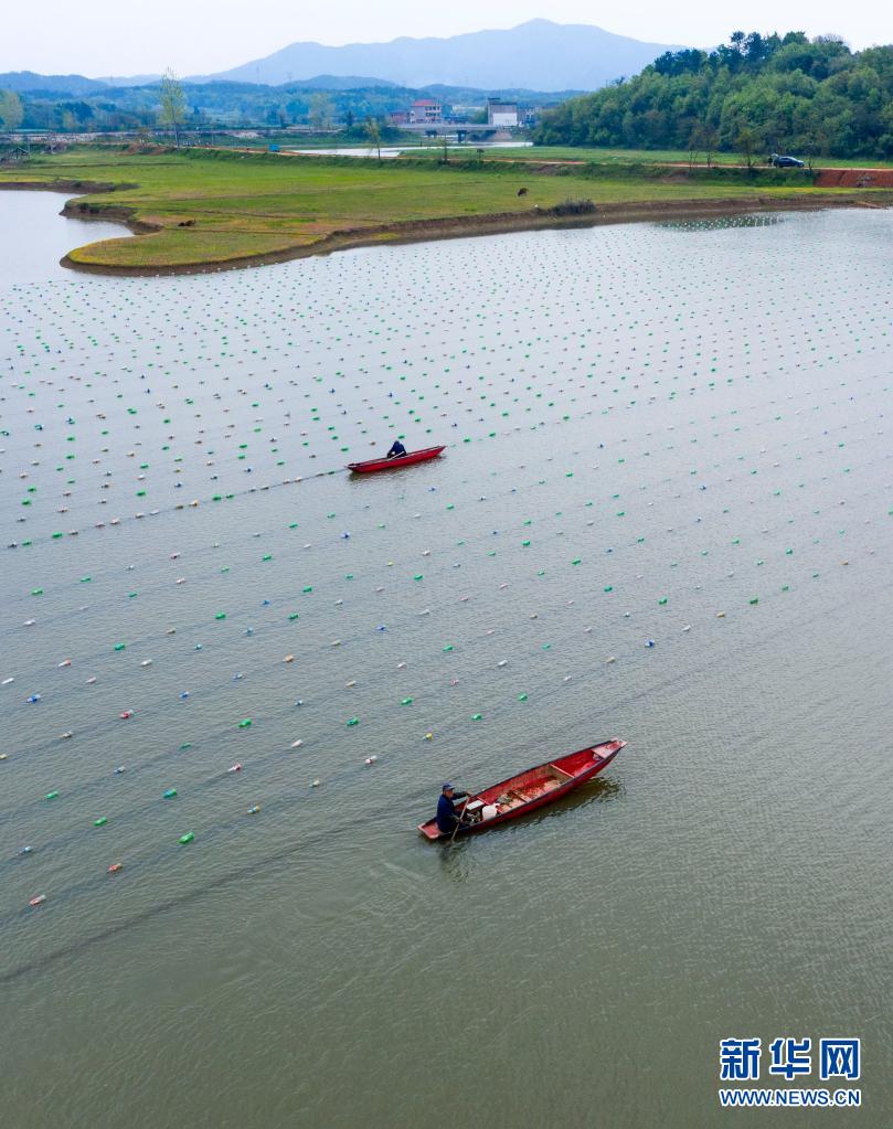 4月6日,在江西省九江市都昌縣新妙湖畔珍珠養殖基地,蚌農在投放珍珠蚌(無人機照片)。 春季裏,隨處可見農民們辛勤勞作的身影,如同一幅幅生機勃勃的畫卷。 新華社發(傅建斌 攝)