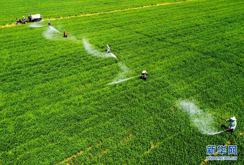 4月6日,安徽省合肥市廬江縣白湖鎮白湖社區,農民在田間進行小麥赤黴病防治作業。 春季裏,隨處可見農民們辛勤勞作的身影,如同一幅幅生機勃勃的畫卷。 新華社發(左學長 攝)