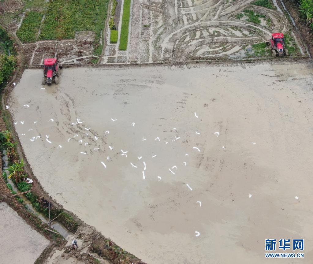 4月6日,浙江省金華市武義縣白洋街道沈宅村農民駕駛農機在田間插種早稻(無人機照片)。 春季裏,隨處可見農民們辛勤勞作的身影,如同一幅幅生機勃勃的畫卷。 新華社發(張建成 攝)