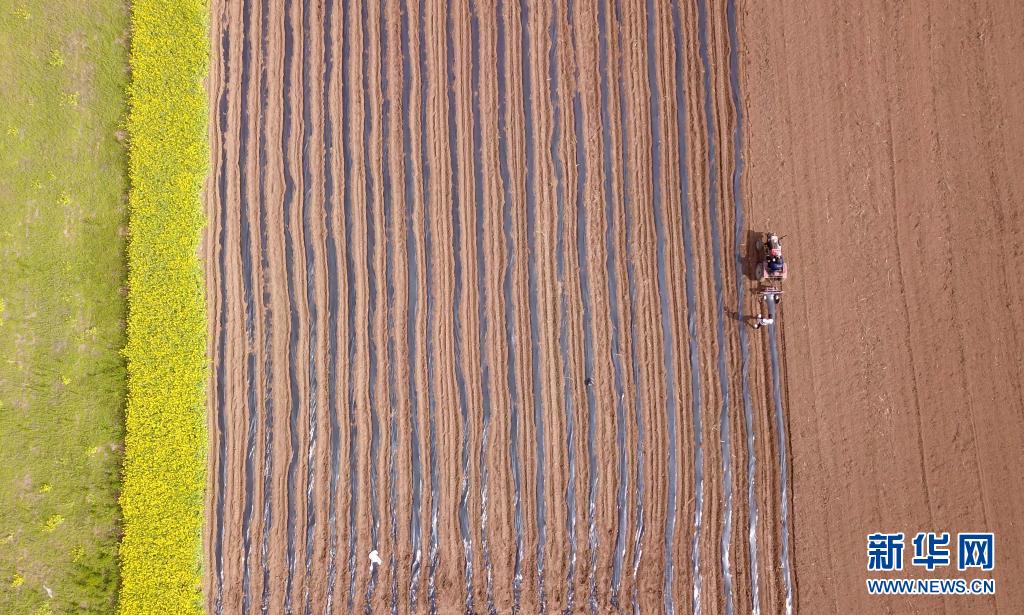 4月6日,在河南省洛陽市汝陽縣蔡店鄉孟腦村,農民駕駛拖拉機在辣椒地裏覆蓋地膜,為及時移栽辣椒做好準備工作(無人機照片)。 春季裏,隨處可見農民們辛勤勞作的身影,如同一幅幅生機勃勃的畫卷。 新華社發(康紅軍 攝)