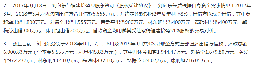 不僅如此,合誠股份在回覆中還披露:“截止目前,劉向東分別於2018年4月、7月、8月及2019年9月共4次以現金方式全部歸還出借方借款,還款總額6000.83萬元(含本金5555萬元,利息445.83萬元),其中歸還黃和賓1944.47萬元、劉德全1679.80萬元、黃愛平972.23萬元、林東明432.10萬元、高瑋琳432.10萬元、郭梅芬324.07萬元、康明旭216.05萬元。”