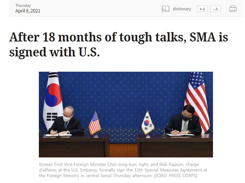 【環球網報道 記者 張海潮】據韓國《中央日報》網站4月8日消息,經過18個月的艱苦談判,韓國與美國週四正式簽署了新的《特別措施協定》(SMA),達成為期六年的國防費用分攤協議。該協定將在韓國國會批准後生效,最早可能在本月。