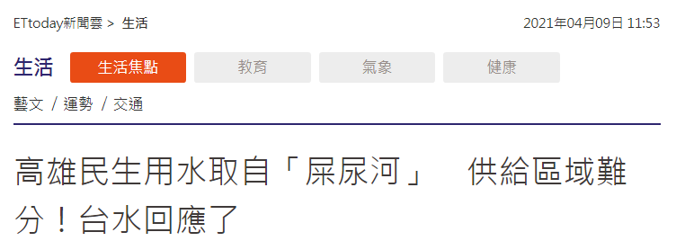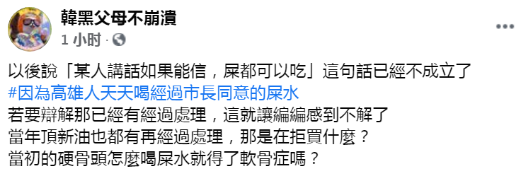 對於高雄民生用水取自“屎尿河”,挺韓國瑜的臉書粉絲專頁“韓黑父母不崩潰”9日發文諷刺説:“以後説‘某人講話如果能信,屎都可以吃’這句話已經不成立了,因為高雄人天天喝經過市長同意的屎水。”↓
