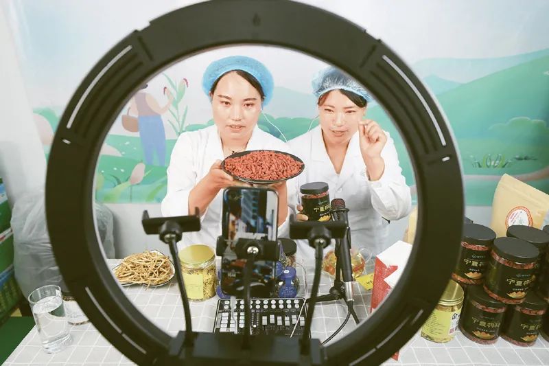 “閩寧禾美”是在閩寧扶貧協作推動下,在寧夏閩寧鎮原隆村建設的一個消費扶貧品牌和電商孵化基地。該基地通過“企業+扶貧車間+貧困户”的模式,引領特色產業發展,讓村民就近就業,穩定脱貧致富。圖為2020年6月11日,村民在家門口的電商扶貧車間直播銷售當地特色農產品。中新社記者 於晶/攝