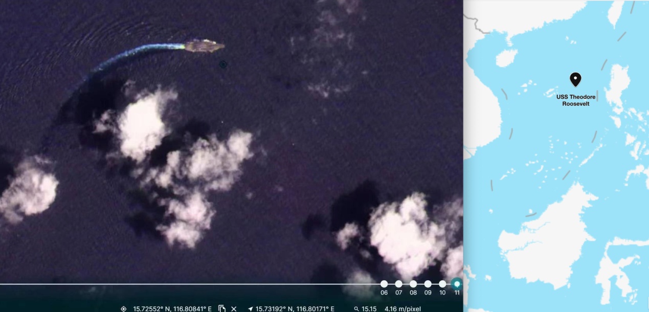 【環球網報道 記者 徐璐明】美國海軍“羅斯福”號航母在南海的最新位置曝光,衞星圖像顯示,該航母位黃巖島西北方向活動。