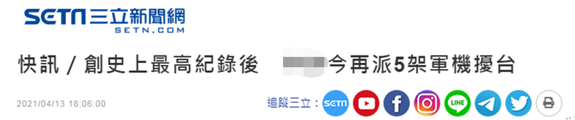 【環球網綜合報道 記者趙友平】島內綠媒“三立新聞網”4月13日聲稱,繼12日大陸派出25架次軍機“擾台”、創下自台灣防務部門發佈解放軍軍機動態以來架數最高紀錄後,台灣防務部門今天(13日)宣稱,“共軍”今天再度派出5架次軍機“侵擾”台灣西南空域,包含一架運-8反潛機、4架次殲-16戰機。
