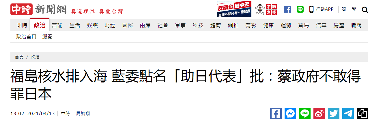 【環球網報道 見習記者 康博浩】據台灣“中時新聞網”4月13日報道,日本首相菅義偉13日宣佈正式決定福島核廢水將在稀釋後排入海中。對此,國民黨“立委”賴士葆點名“駐日代表”謝長廷,為什麼謝長廷好像變成真正的“助日”代表,總是不敢得罪日本政府,隔三差五還要為日本人講話。