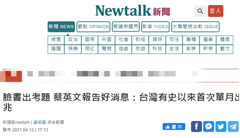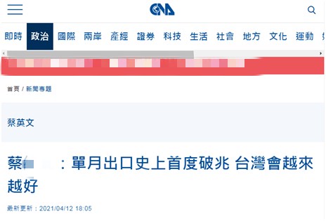 蔡英文在臉書中還聲稱,“這個數字代表台灣達成了三個不容易的紀錄”:有史以來第一次,台灣單月出口超過一兆元新台幣;連續第9個月,出口維持正增長;相較於去年3月,出口的年增率,更是高達27.1%。