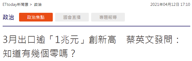 “東森新聞雲”則在報道中提到蔡英文帖文稱,“一兆元(新台幣)有幾個零?能不Google就算出來的人,請留言告訴我!”