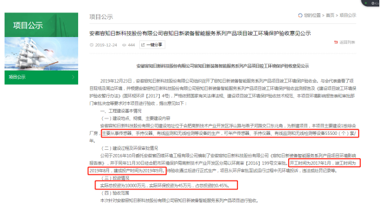 但公開資料《容知日新裝備智能服務系列產品項目竣工環保驗收意見公示》顯示,該項目2016年11月30日經合肥市環境保護局高新技術產業開發區分局以環高審【2016】199號文審批。開工時間為2017年1月,竣工時間為2019年8月,建成投產時間為2019年9月。項目實際總投資為10000萬元。