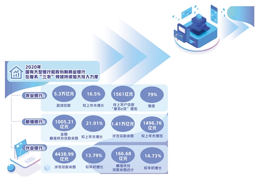 鄉村振興是我國“十四五”時期的重要任務之一,商業銀行如何發揮自身優勢,破解農村金融服務的難點和痛點,為鄉村振興戰略的實施提供有力保障?梳理各上市銀行2020年年報信息可以發現,無論是國有大型銀行還是股份制商業銀行,在服務“三農”領域都在持續加大投入力度,取得了卓有成效的業績。