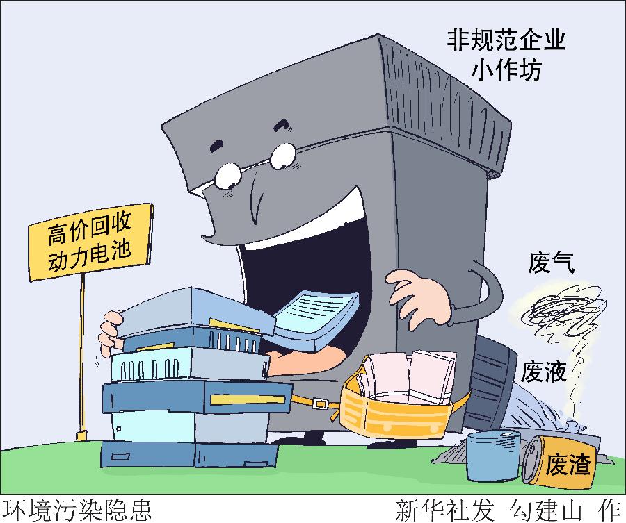 動力電池回收亂象,帶來環境污染隱患。張哲鳴説,在動力電池拆解破碎、有價金屬提取過程中,一些“小作坊”不對產生的廢氣、廢液、廢渣進行處理,甚至任意排放。因為技術不到位,廢舊電池資源化利用效率低,存在資源浪費,在拆解過程中還存在爆炸風險。