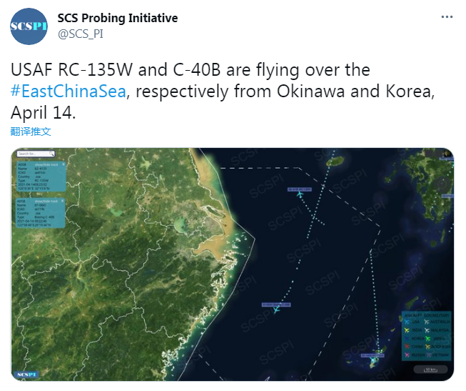 “南海戰略態勢感知”計劃平台4月14日發佈消息稱,當天美國空軍一架RC-135W偵察機和C-40B運輸機在東海上空飛行,兩機分別是從沖繩和韓國起飛。