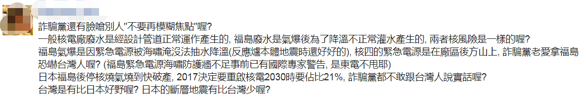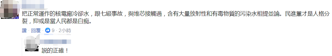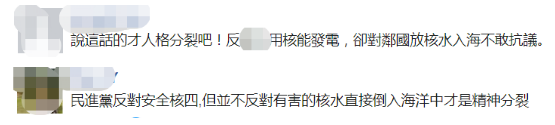還有網友表示,把正常運作的核電廠冷卻水,跟發生七級核事故後,與融化堆芯接觸過、含有大量放射性和有毒物質的污染水相提並論,“民進黨才是人格分裂,抑或是當人民都是白痴。”↓