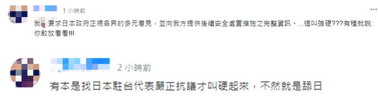 還有網友直言,“台灣要求日本政府正視各界的多元意見,並向我方提供後續安全處置措施之完整資訊。…這叫強硬???有種就説:你敢放看看!!!”“有本事找日本駐台代表嚴正抗議才叫硬起來,不然就是舔日。”