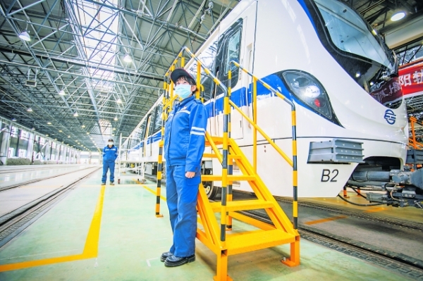 工作人員在白雲車輛段為軌道交通2號線試運行列車駛出站台做準備。