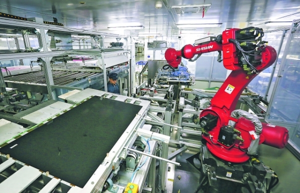 海信工業園,一台紅色智能機器人正在傳送一塊65英寸的大屏幕。