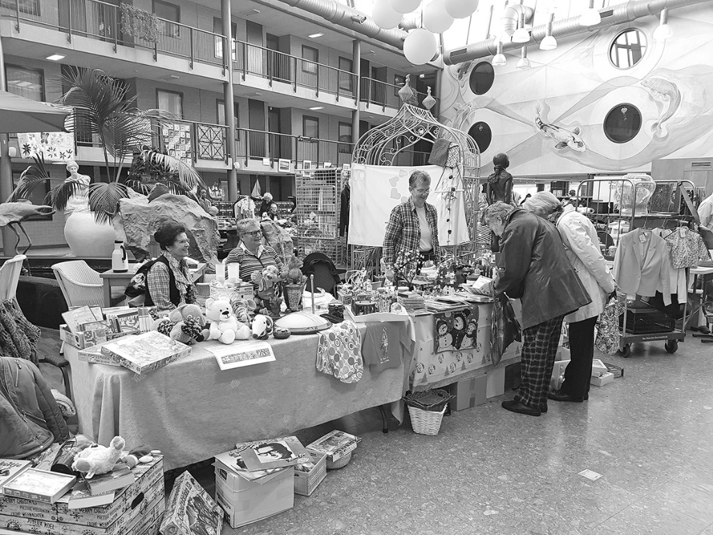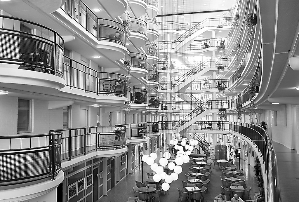生命公寓建築內部有一箇中庭,連接公寓走廊,便於大家交流。中庭內還有酒吧、餐廳、超市、美髮沙龍等服務設施。平時,這裏還可以組織很多活動,創造 “泛家庭”氛圍。