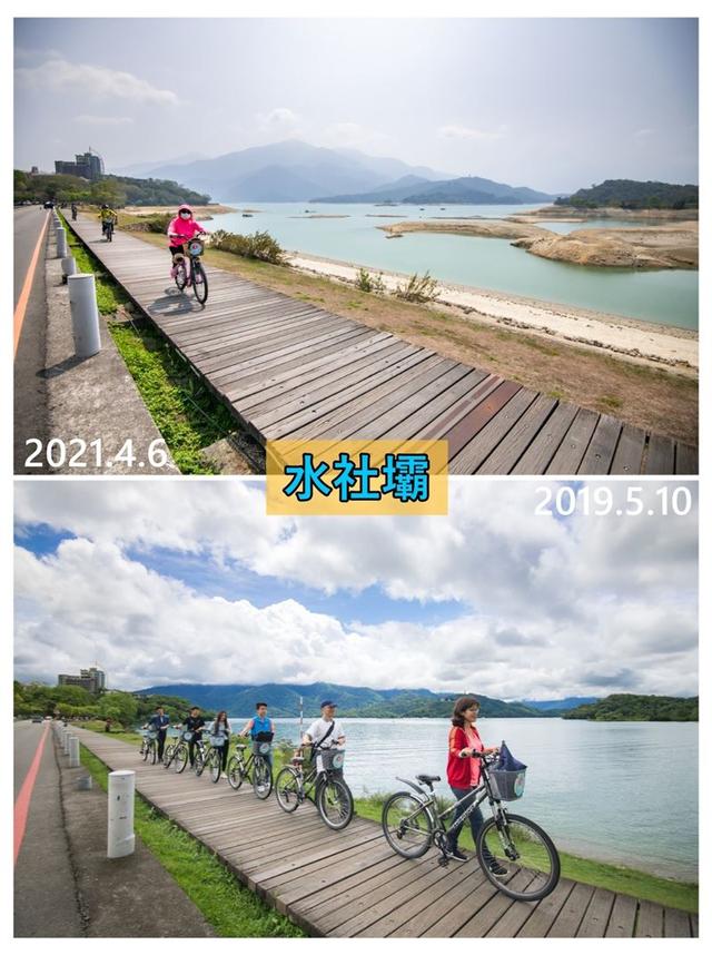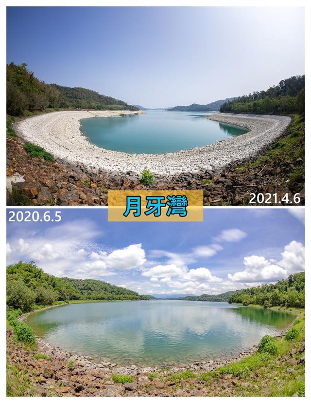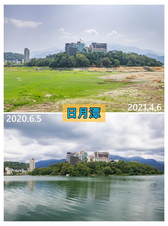 日月潭所在的南投縣政府日前在社交網站上一連貼出7張知名景點的今昔對比照,包括日月潭、月牙灣、向山落羽松林、水社壩、日月潭自行車道、朝霧碼頭及大竹湖出水口,每張照片都可明顯看到缺水帶來的嚴重影響。