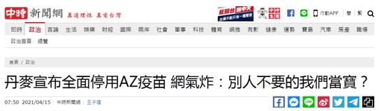 中時新聞網稱,丹麥全面停用阿斯利康疫苗的消息傳回台灣,引發許多島內網友對民進黨當局的不滿。有人批評説:別人的垃圾我們卻當寶。↓