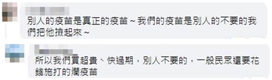 有人表示,別人的疫苗是真正的疫苗,我們的疫苗是別人的不要的我們把它撿起來;所以我們買超貴、快過期、別人不要的,一般民眾要花錢施打的爛疫苗。↓