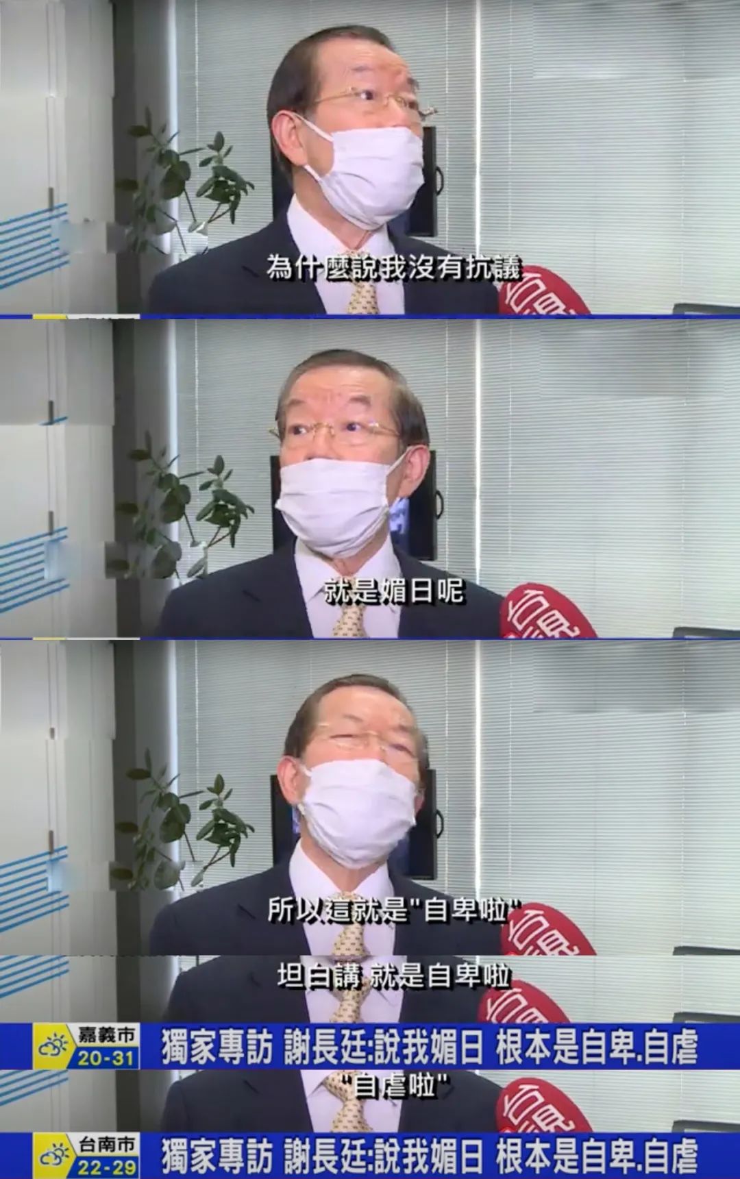 台灣省媒體台視新聞4月15日報道稱,因為對日本排放核廢水一事沒表達嚴正抗議,台當局所謂的“駐日代表”謝長廷捱罵多日後,面對《台視新聞》的獨家鏡頭“大吐苦水”。謝長廷叫冤稱,“為什麼説我沒有抗議就是媚日?所以這就是自卑!坦白講就是自卑啦!自虐啦!”