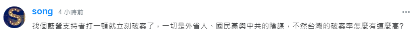 雅虎奇摩網站上,網民Z留言道:“總統府?不就也是一天到晚在放假消息的中心嗎?”網民song留言嘲諷道“找個藍營支持者打一頓就立刻破案了,一切是外省人、國民黨與中共的陰謀,不然台灣的破案率怎麼有這麼高?”