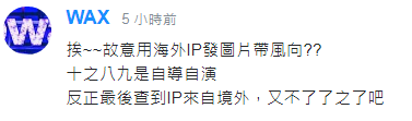 “挨~~故意用海外IP發圖片帶風向??十之八九是自導自演,反正最後查到IP來自境外,又不了了之了吧。”島內的雅虎奇摩網站上,網民WAX留言道。該網站上,網民留言最多的就是質疑民進黨當局“自導自演”。