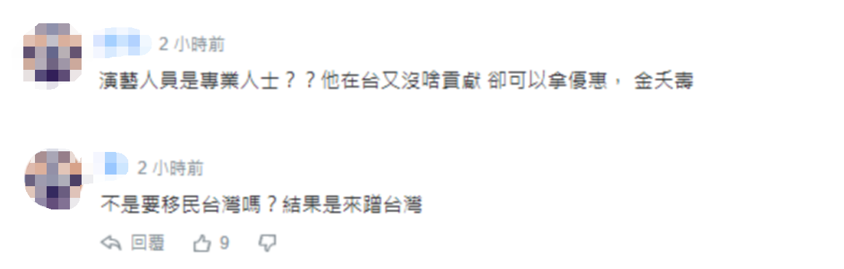另外,還有些網友諷刺,“他在台又沒啥貢獻,卻可以拿優惠。”“不是要移民台灣嗎?結果是來蹭台灣。”↓