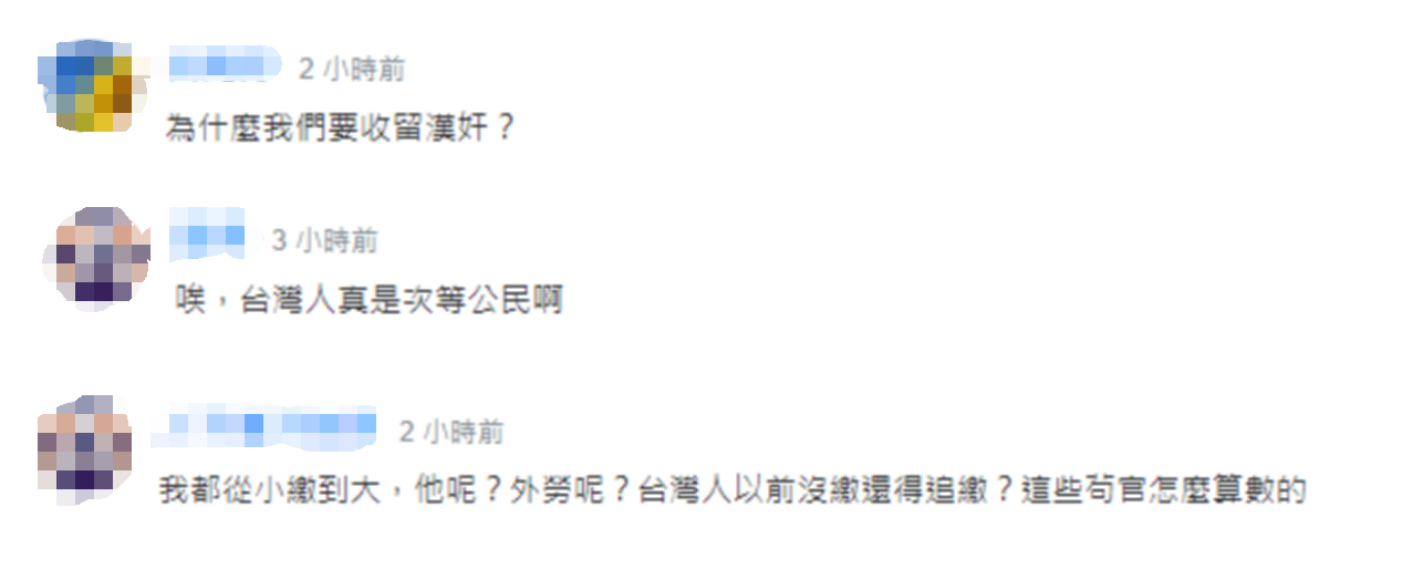 還有網友無奈表示,“為什麼我們要收留漢奸?”“唉,台灣人真是次等公民啊。”“我都從小繳到大,他呢?外勞呢?台灣人以前沒繳還得追繳,這些狗官怎麼算數的。”