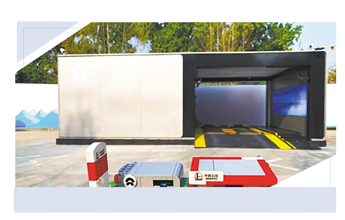 北京中石化朝英站充換電裝置可自動停泊、自動換電。 (資料圖片)