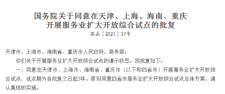 【環球網綜合報道】近日,國務院印發《關於同意在天津、上海、海南、重慶開展服務業擴大開放綜合試點的批覆》,原則同意四省市服務業擴大開放綜合試點總體方案,試點期為自批覆之日起3年。