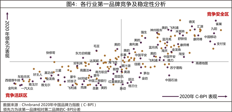 行業內的品牌競爭無時不在,從C-BPI發佈的11年數據來看,行業第一品牌被逆轉已經成為常態。我們回看2021年黃金品牌和被逆轉的品牌在2020年的表現,以2020年C-BPI得分為橫軸,以2020年第一品牌相對於第二品牌的領先力為縱軸構建了一個可供回溯的象限圖。我們發現在過去5年連續獲得行業第一的品牌絕大部分出現在右上角區域,自身品牌力表現高且相對於第二名的領先力也高,我們把這個象限稱為競爭安全區。而與之相反,那些今年被逆轉的品牌超過80%出現在左下角的區域,我們把它稱為競爭活躍區。