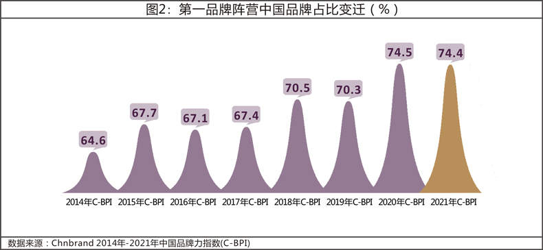 2021年C-BPI中國品牌力指數調查數據覆蓋的203個品類第一品牌中,中國品牌仍然佔據主導地位,佔比為74.4%。較2014年,中國品牌佔比增加了近10%,在過去8年間,中國品牌已經取得了巨大的品牌建設成果,總體品牌競爭力逐年提升,正在各個領域表現出強勁的生命力。