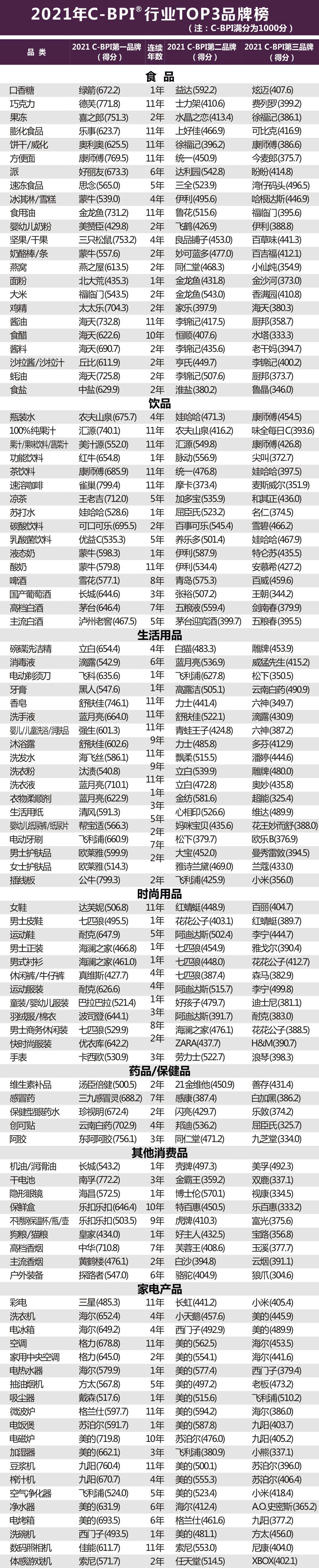 而更值得讚譽和學習的,是那些從中國品牌力指數(C-BPI)自2011年首次發佈以來,始終穩居行業第一的品牌。在過去11年連續發佈的75個品類中,總計有29個品牌取得了這樣的巔峯成就,包括:奧利奧(餅乾/威化)、金龍魚(食用油)、海天(醬油)、樂事(膨化食品)、美汁源(果汁/果味飲料/蔬菜汁)、蒙牛(酸奶)、康師傅(方便麪)、舒膚佳(香皂)、強生(嬰兒/兒童洗浴/潤膚品)、藍月亮(洗衣液、洗手液)、格力(空調)、格蘭仕(微波爐) 、九陽(豆漿機)等。