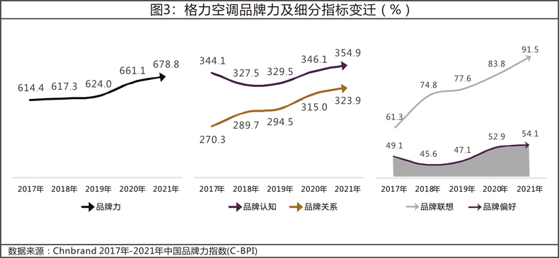 格力(空調)是這些品牌的典型代表,不僅連續11年持續奪冠,也是全行業品牌中為數不多的品牌力連續5年持續提升的品牌。分析格力近5年的品牌力發展狀況,我們可以看到,其品牌力的攀升得益於認知的穩定和品牌關係的不斷向上。格力在品牌關係指標中,連續多年保持了行業高水平的品牌偏好,品牌聯想也持續躍升。格力的相關性、獨特性、一致性從2017年的57.0 、60.5 、66.3分,均提升至2021年的91分以上,得到了市場的高度認可。