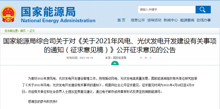 【環球網 記者 陳超】4月19日,環球網財經從國家能源局瞭解到,為做好2021年度風電、光伏發電開發建設管理工作,持續推動風電、光伏發電高質量發展,國家能源局組織有關單位研究起草了《關於2021年風電、光伏發電開發建設有關事項的通知》,現面向社會公開徵求意見,徵求意見時間為2021年4月19日至4月25日。