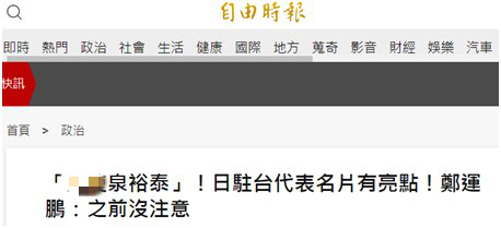 除了“三立新聞網”,親綠的《自由時報》也注意到這一消息,還興奮稱“日駐台代表名片有亮點”。